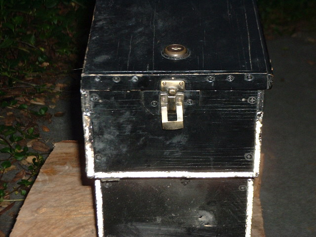 The back of the box. The latch needs to be attached to a trim backing, going straight into the plywood just doesn't work. A "skirt" attached to the lid, combined with a equal-thickness section of trim behind the lower latch, do the trick. The brass mailbox (?) lock looks and works well. You'll definetly want to find locks with matching keys, hopefully your hardware store will have some of these, if not you may be able to sort through a bunch of locks and find two (or more!) that use the same key. Some have key codes to help with this.