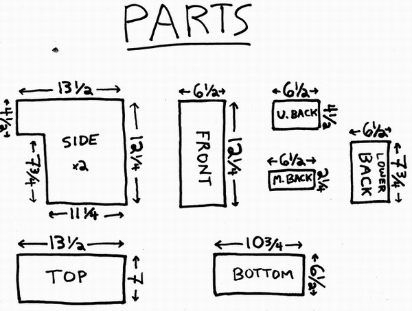 The main wooden parts of the puzzle. Cut the bottom after you've assembled the sides, then cut the top last. Try to get the pieces exact, for me the 6-1/2"s often ended up being more like 6-3/8". I'm hoping that exact cuts will allow a full 6-1/2".