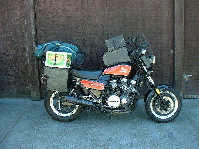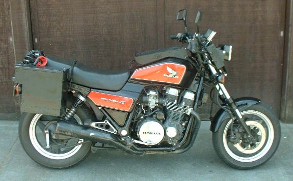 My bike's around-town clothes. Visible are hard bags for riding pants and other items, tank rack for things like groceries, seat bungee cord for a daypack, and locks for the helmet (and occasionally the bike). Note that this is a post-crash shot of my so-called Nighthawk ST.