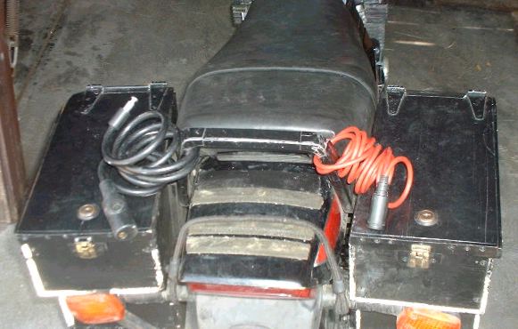 How about a couple of brewskis? Using this system, I can get one 12- or 18-pack pack on each side, and another twelver on the tank trunk. That's a total capacity of about two cases, in addition to a full touring load. Pretty cool! My friends at the Reno Air Races were impressed. I imagine that all sorts of external loads could be carried this way, allowing for all kinds of whacky contingencies.