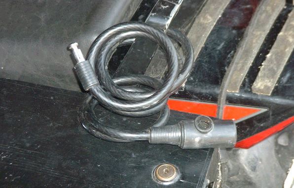 I'm surprised how rarely I see this picture on other people's bikes. Sure, the locks bounce around a bit, but the utility value is truly amazing. With one or two of these hanging from your grabrail, you are always seconds away from locking the helmet and gettin' on with life, rather than carrying it with you into the store, restaurant, bar, or whatever. (I even leave the helmet on the bike when visiting friends, at parties, etc. Why cause a scene?) You can also run a cable through an arm of your riding jacket, partially secure a backpack, tennis racket, etc. The possibilities are endless.