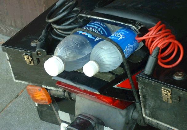I just discovered this possibility, and so far it's worked really well. Water is one of those annoying things to carry on a bike, because it's fairly bulky and very heavy. Having an extra quart or more, not too far from the bike's center of gravity, is great. You'll probably want to cover the tail section to prevent abrasion (weather stripping and black duct tape visible above), attach a single bungee to the turn signal stocks, and keep your eyes open for slim waterbottles with screw-on tops. Aguafina quart bottles, and any 16-24 oz bottles, work well. Bottles that use brittle plastic, like Crystal Geyser, aren't the best.