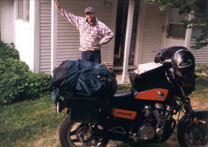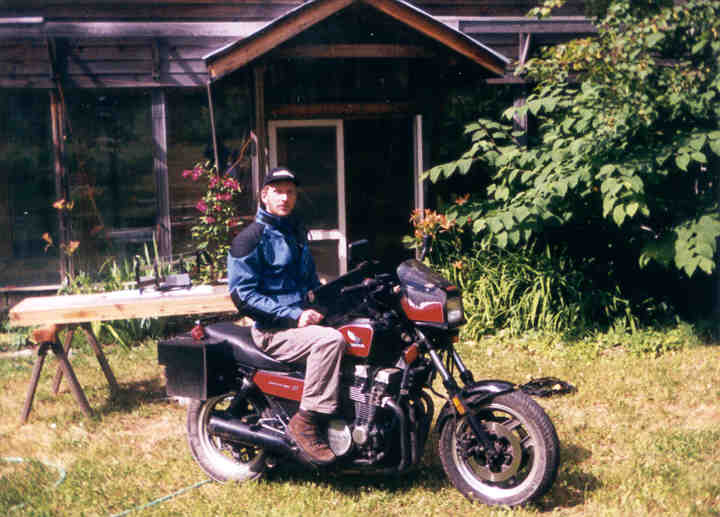 Yours truly, mugging for the camera in my standard summer touring duds. The house, half an hour south of Colville, WA, belongs to my kind host and long-ago neighbor Eleanor.