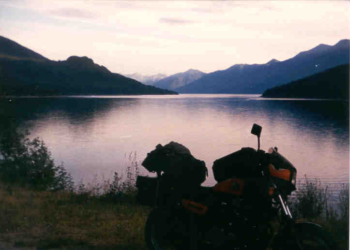 Late afternoon on Kootenay Lake in British Columbia. The ferry which crossed the lake claimed to be the world's longest free ferry. Seeing the bike teeter on it's centerstand on a moving boat was a bit unsettling.