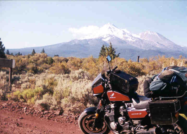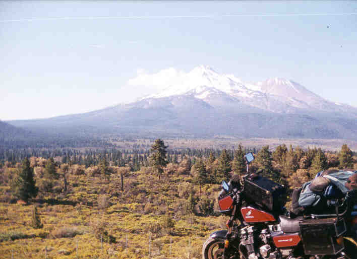 At the town of Weed (nice looking town if I recall) I departed I-5 for US97, which goes around the north end of Shasta. A few miles down a dirt road I camped, not exactly welcoming another party that arrived as I was turning in to bed. (I started and revved my engine so they'd know I was there, but they didn't seem to care. Oh well, at least they left first thing in the morning.) With me not much behind them, heading for the Oregon border and stopping for the occasional (awesome) photo of Shasta.