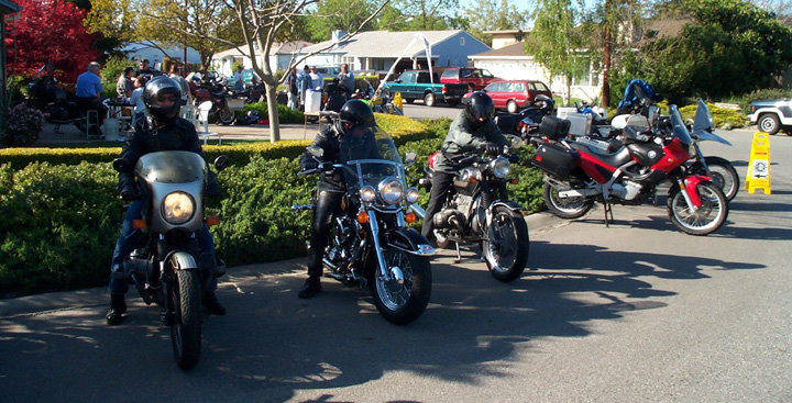| Mark and his friends heading out for the return trip to Sacramento. As can be seen, Airheads welcome all comers to their events. Here's a Harley next to two R bikes, with an F650 parked next to an 1150 in the background. |