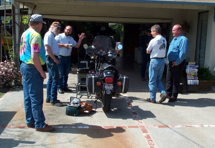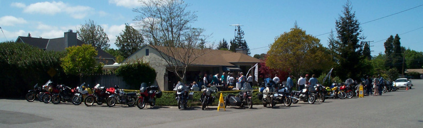 A quick snapshot of the Tech day held at Gary Hanson's house in Palo Alto today. Over thirty motorcycles in front of the house. Several projects were completed, including two carburetor overhauls, one starter swap, and a GS steering bearing adjustment. An R100 was also parked in the "shop" area with a large drip pan underneath the engine, its owner apparently a victim of "Brit Bike envy".
